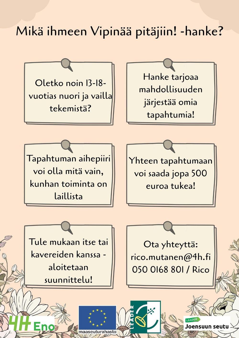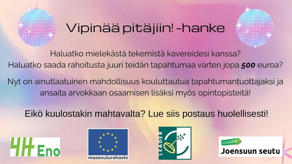 Enon 4H toteuttaa Vipinää pitäjiin! -hankkeen Pyhäselän pitäjän alueella vuosina 2025-2026. Hanketoimintaa on mahdollista toteuttaa myös Enon pitäjän alueella.