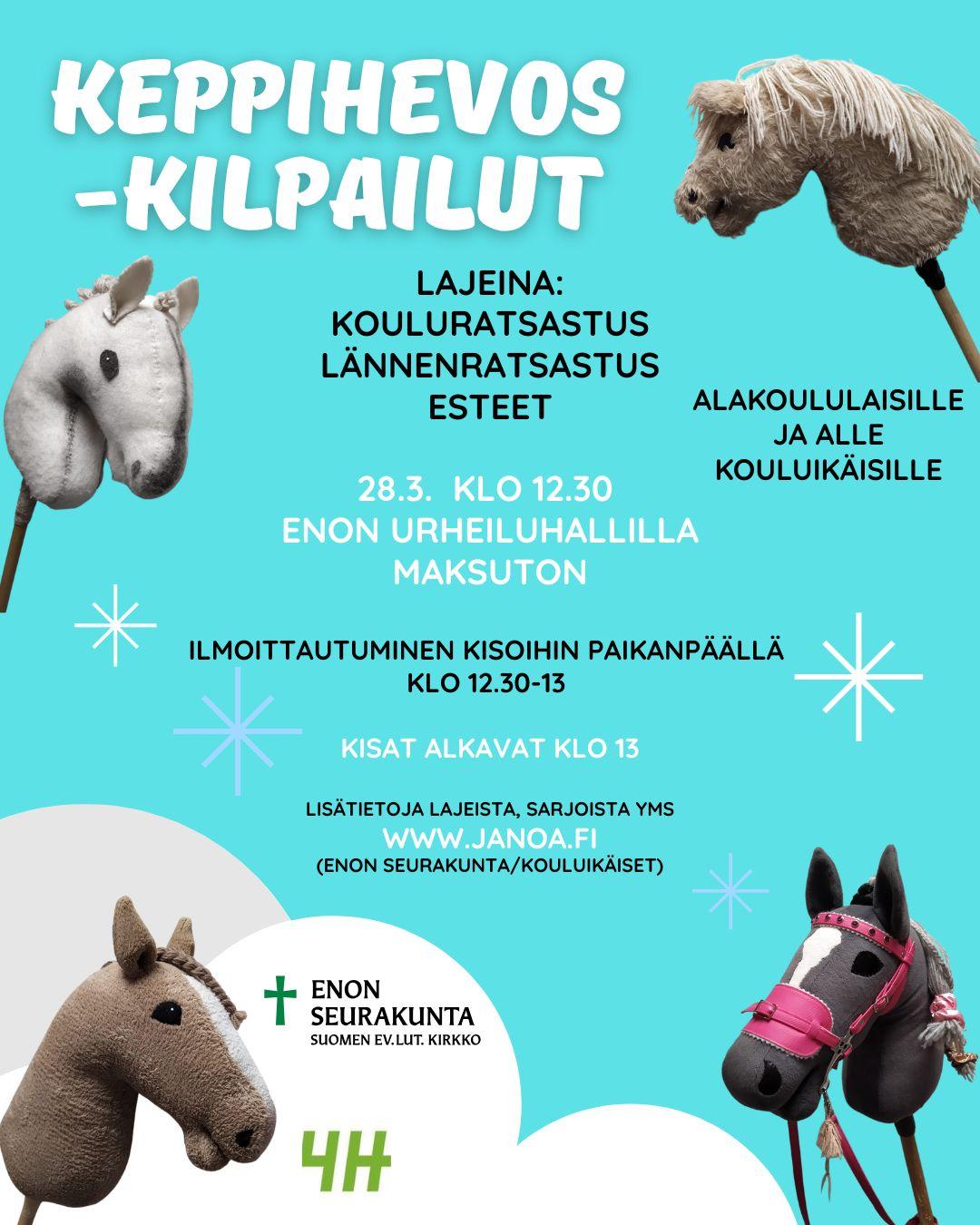 Enon 4H ja Enon seurakunta järjestävät yhteistyössä keppihevoskilpailut 28.3.2026 alakouluikäisille ja sitä nuoremmille Enon urheiluhallilla klo 13.00. (ilmoittautuminen klo 12.30).